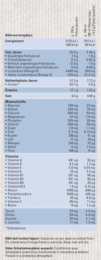 Glukosesirup, pflanzliche Öle (Sonnenblumenöl, Kokosöl, Rapsöl, Leinöl), Sojaproteinisolat, Mineralstoffe (Calciumphosphat, Kaliumchlorid, Kaliumcitrat, Magnesiumchlorid, Natriumcitrat, Eisenglukonat, Zinksulfat, Kupfersulfat, Kaliumjodat, Natriumselenit), Emulgator (Mono- und Diglyceride von Speisefettsäuren), Vitamine (Vitamin C, Niacin, Vitamin E, Pantothensäure, Vitamin B2, Vitamin B1, Vitamin A, Vitamin B6, Folsäure, Vitamin K, Biotin, Vitamin D, Vitamin B12), Cholin, Taurin, Methionin, Antioxidationsmittel (Sojalecithin, Ascorbylpalmitat, Alpha-Tocopherol), L-Carnitin, Inositol.